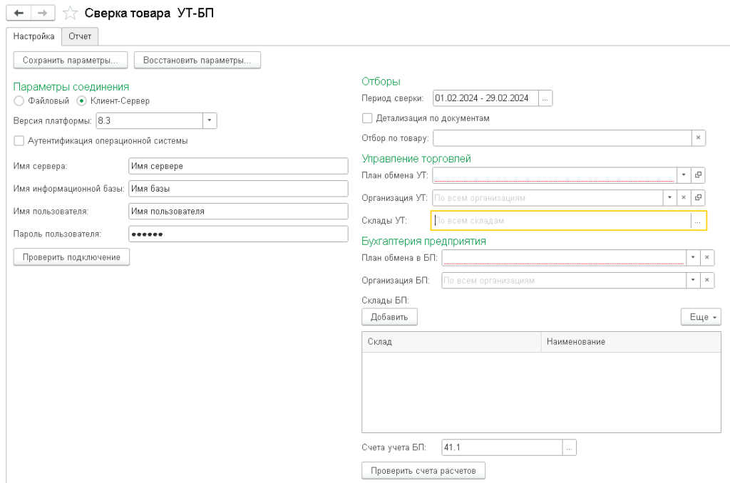 Отчет предназначен для сверки остатков и оборотов номенклатуры между «1С Управление Торговлей 11» (локализованные 3.0) и «Бухгалтерия Предприятия 3.0» (локализованные 2.0) в разрезе номенклатуры, складов и документов. Отчет запускается на стороне «1С Управление Торговлей».