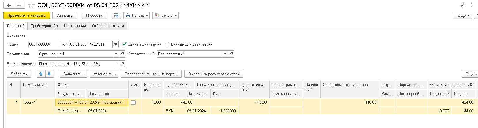 Расширение предназначено для конфигурации «1С Управление торговлей для Беларуси 3.0». Используется для формирования и контроля цен согласно постановлениям, ограничивающим наценку на товар. Для корректной работы расширения требуется настройка учета себестоимости по сериям.