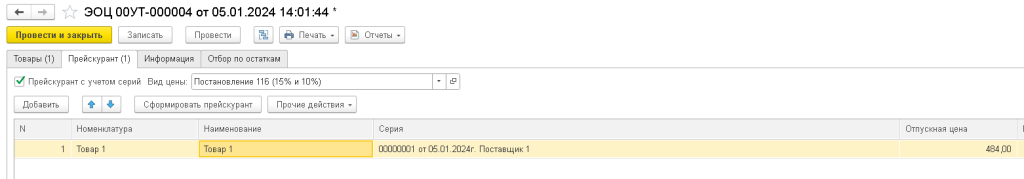 - Документ «Экономическое обоснование цены». Используется для расчета отпускной цены и формирования прейскуранта цен. Прейскурант цен формируется в разрезе серий номенклатуры. Документ может формироваться на основании других документов, заполняться в ручную или заполняться по остаткам товаров. Есть возможность указания суммы расходов в цене продажи и вывода этой информации в примечании печатных форм (ТН, ТТН).